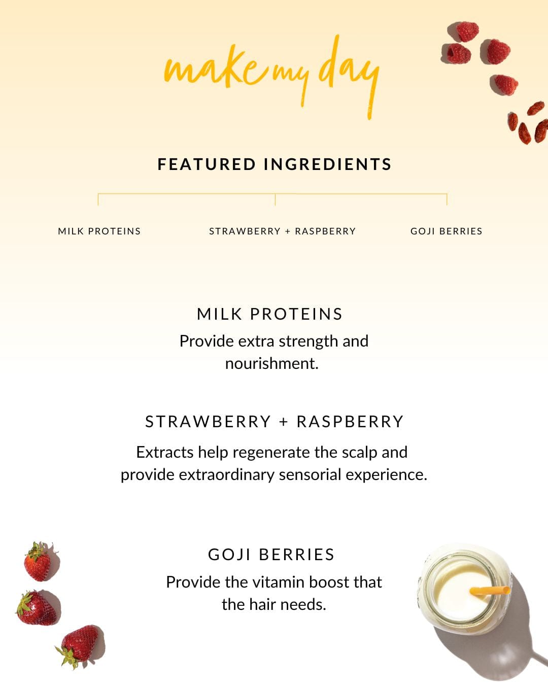 Ingredients: Aqua (water), Ammonium, Lauryl Sulfate, Sodium Chloride, Cocamidopropyl Betaine, Glycerin, Dicaprylyl Ether, Styrene/Acrylates Copolymer, Decyl Glucoside, Guar Hydroxypropyltrimonium Chloride, Tocopheryl Acetate, Glyceryl Oleate, PEG-8 Dimethicone, Coco-Glucoside, Hydrolyzed Milk Protein, Rubus Idaeus (Raspberry) Leaf Extract, Lycium Barbarum Fruit Extract, Fragaria Ananassa (Strawberry) Fruit Extract, Parfum (Fragrance), Benzoic Acid, Citric Acid, Sodium Hydroxide, Sodium Benzoate, Phenoxyethanol, Methylchloroisothiazolinone, Glycine, Sodium Lactate, Potassium Sorbate, Methylisothiazolinone, Magnesium Nitrate, Magnesium Chloride, Sodium Citrate.